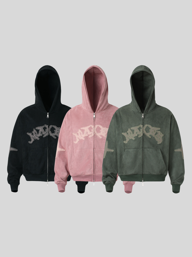 ダメージパッチ刺繍 短丈ダブルジップパーカー